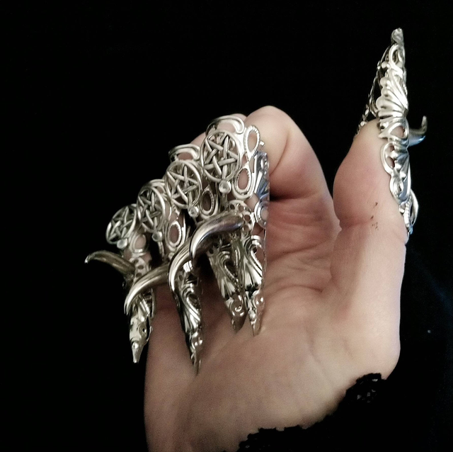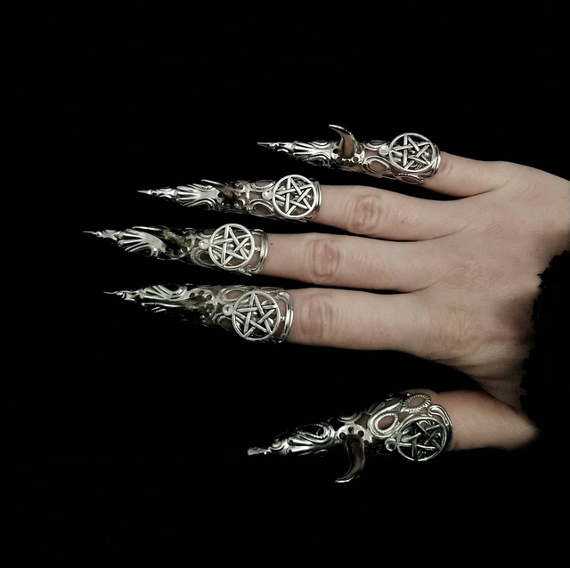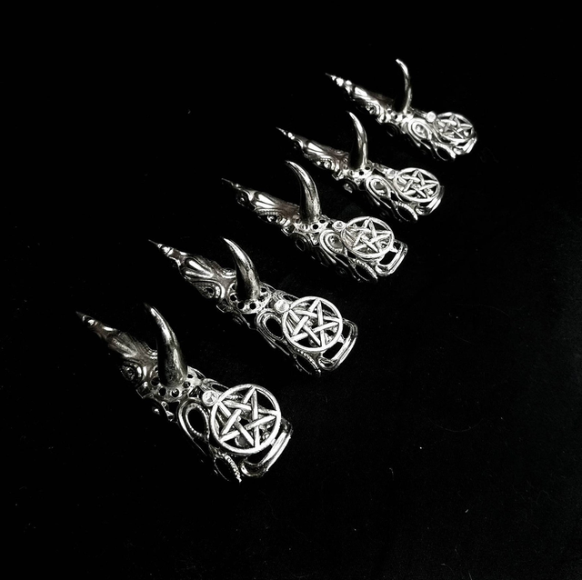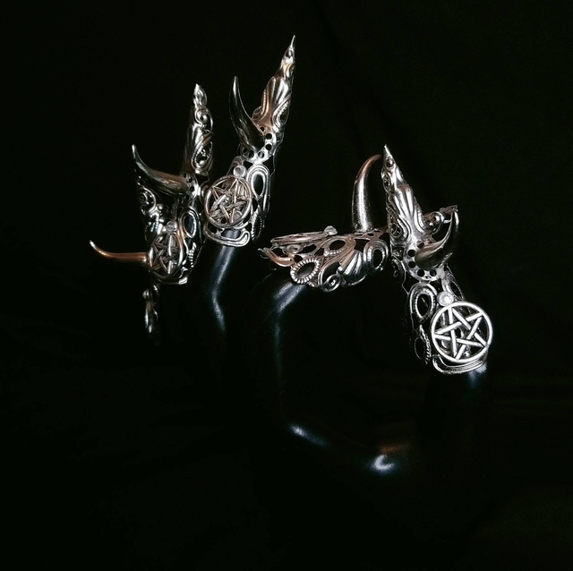 Devilishly dark rings adorned with a pentagram, curved spike and silver rhinestone. Perfect for witches, dark cosplays, gothic events and alternative photoshoots.