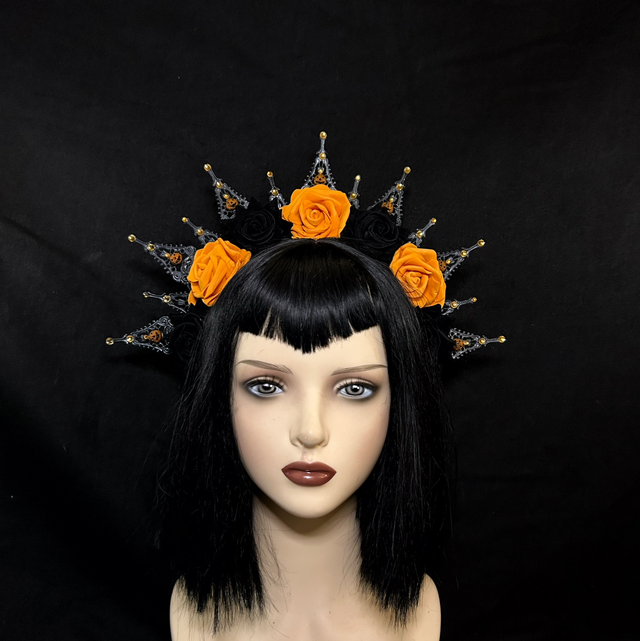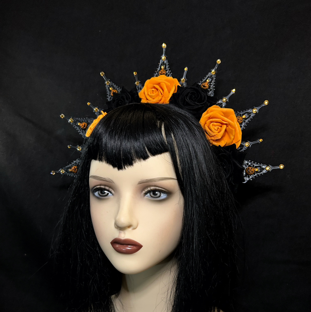 Hand-crafted with a halo of deep black metalwork and crowned by vivid orange and black roses, Jackelyn evokes the glow of jack-o’-lanterns under a moonlit sky. Gold-tipped spires rise like enchanted flames, adding height and a regal silhouette that’s perfect for costumes, cosplay, or dramatic seasonal photoshoots.