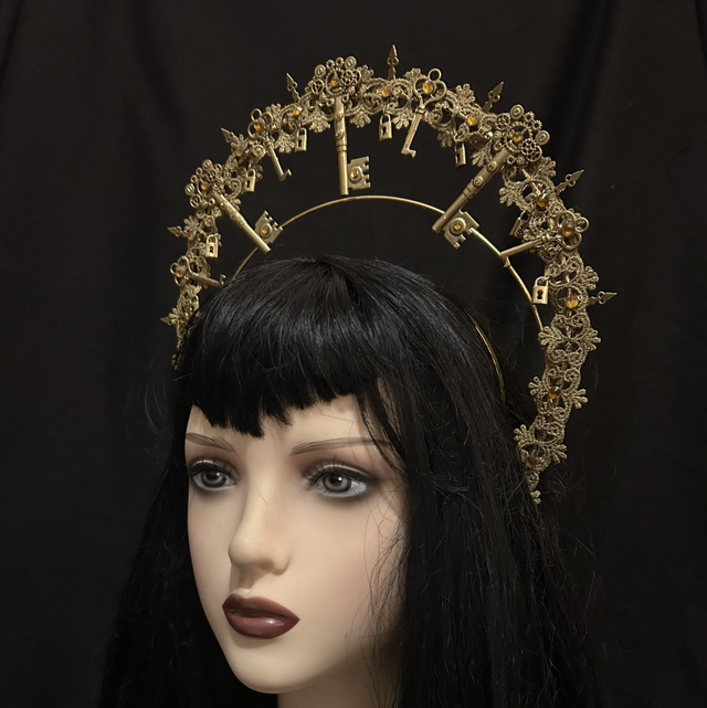 Unlock your statement style with the Lock & Key crown — a one-of-a-kind steampunk-inspired halo crafted in ornate gold. Adorned with an assortment of vintage-style keys and tiny padlocks, this headpiece weaves mystery and elegance into a striking silhouette. Gold rhinestones add a subtle glint, like secrets waiting to be discovered.
