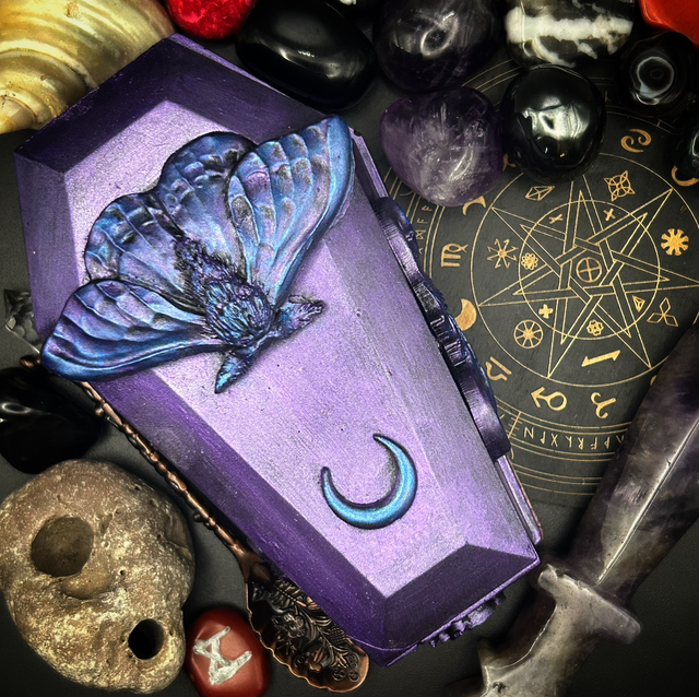 Keep your treasures in celestial gothic style with this handcrafted purple coffin jewelry box. Adorned with a delicate moth and moon motif, baroque detailing along the sides, and a rose accent at the end, it’s as decorative as it is functional. Perfect for rings, necklaces, and small trinkets, this piece adds a touch of mystical elegance to any collection.