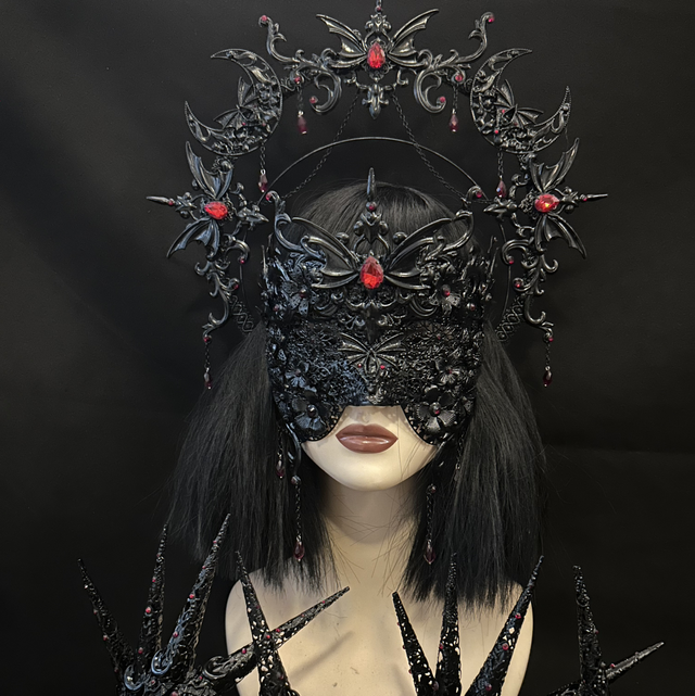 Nosferatu crown and mask. Beautiful gothic vampire themed mask with winged bat ascents, blood drop gems and decorative flowers and filigree in a baroque style. Finished with hanging little blood drop beads.
