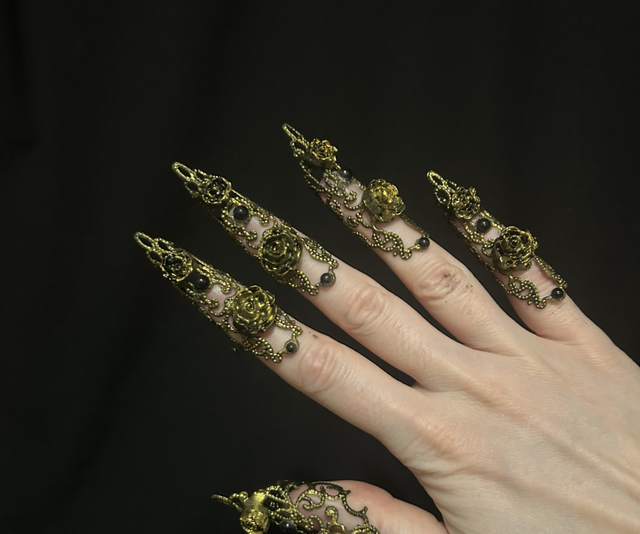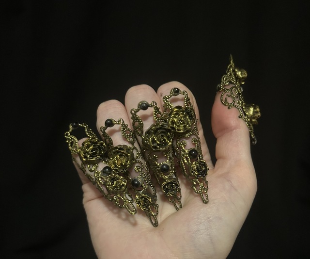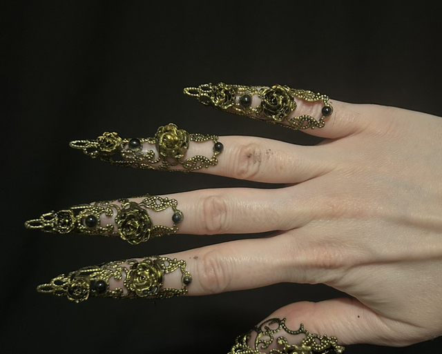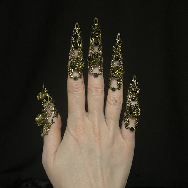 Beautiful golden rose themed Nail rings with a black pearl gem design. Perfect match to the Rosarium mask and crown set! works well for a valentines gift, weddings, photoshoots, fantasy balls, cosplays, gothic events and more