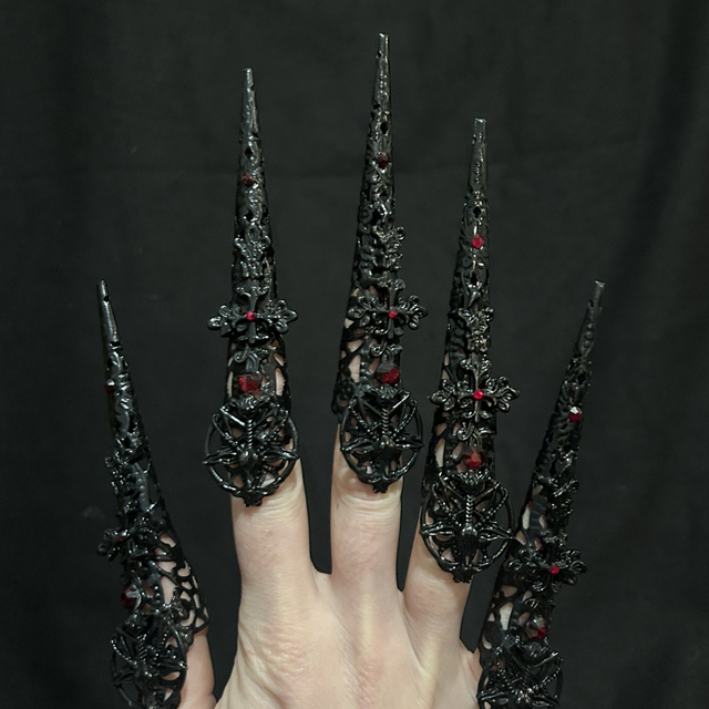 Lovely set of 5 satanic themed nail claws with inverted satanic pentagram, inverted cross, pure black base and red rhinestone adornments.