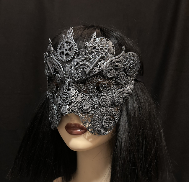 This handcrafted blindmask features a brushed silver finish, adorned with intricate cogwork, antique-style keys, and industrial detailing that nods to Victorian futurism. The design blends mystery and machinery, making it the perfect statement piece for steampunk events, alt fashion shoots, cosplay, or theatrical styling.