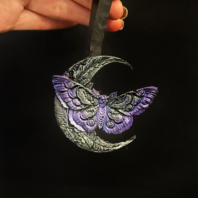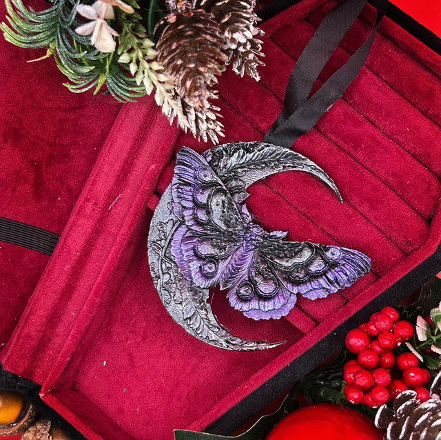 Add a touch of mystical elegance to your décor with this beautifully crafted ornament featuring a detailed moth resting on a crescent moon. Designed with ornate, intricate patterns, this piece shines in a brushed silver finish accented with a rich purple effect—perfect for lovers of celestial, gothic, or nature-inspired décor.