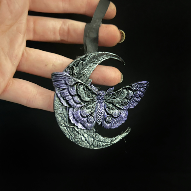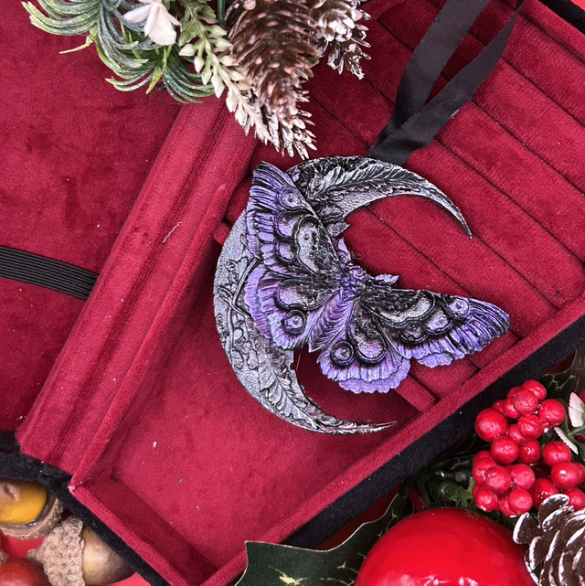 Handcrafted Moth on Crescent Moon Ornament – Brushed Silver & Purple Ornate Design
