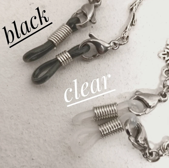 Suitable for all glasses types. The elastic loops fit comfortably on your frames without causing damage. Wear them near the front to make a statement or further back on your frames to appear like earrings. Choose between a black or clear loop connector to connect the chain to your glasses.