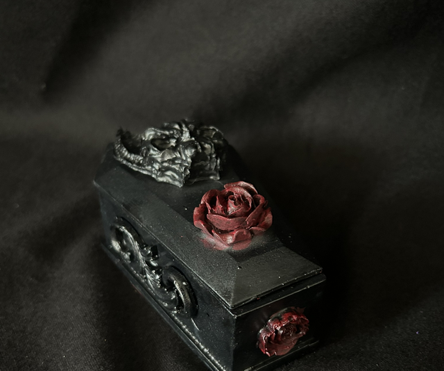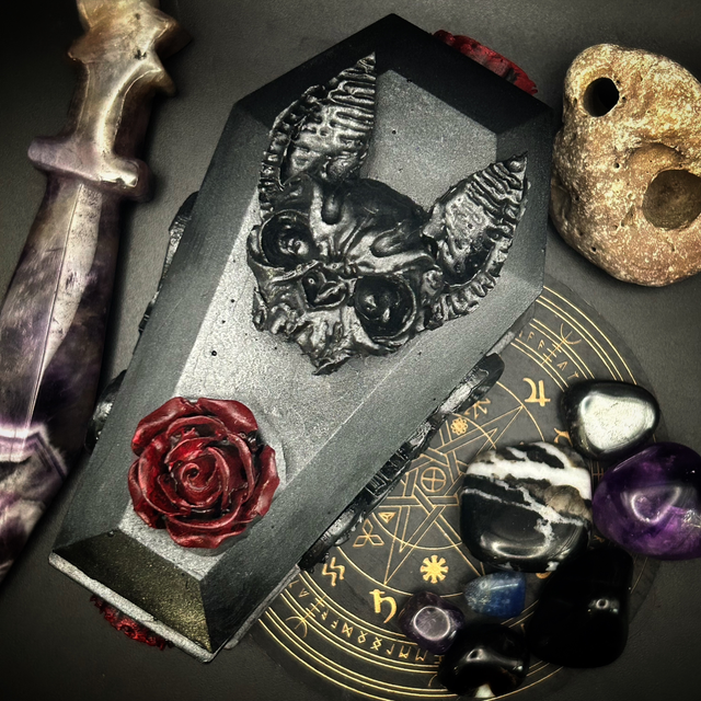 Store your treasures in gothic elegance with this handmade vampire coffin jewelry box. Finished in brushed black, it features a vampire bat skull, rose adornments, and baroque detailing on the sides. Perfectly sized for small trinkets, rings, and necklaces, this dramatic piece adds a touch of dark romance to any vanity or dresser.