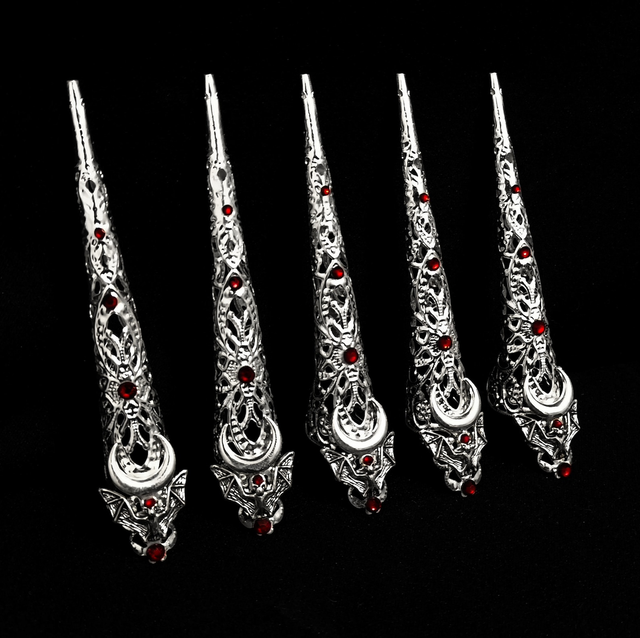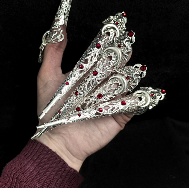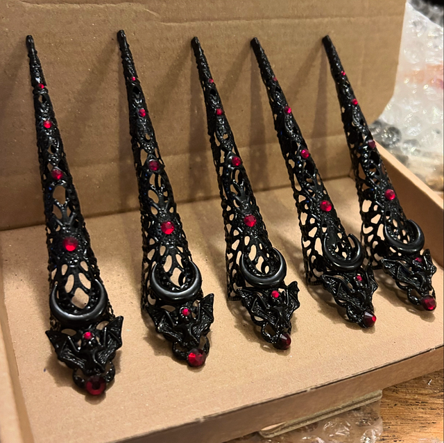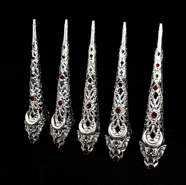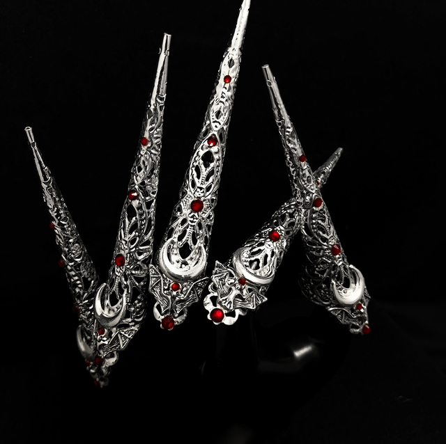Beautiful long nail claws, decorated with bats and moons and adorned with blood red rhinestones. Rings are adjustable.