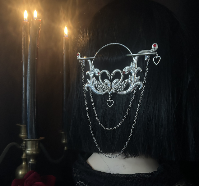 Draped with ornate filigree chainwork and touched with deep red rhinestones, this piece glimmers with quiet passion. The accompanying hair stick is finished with a tiny hanging heart, swaying softly like a secret kept close.